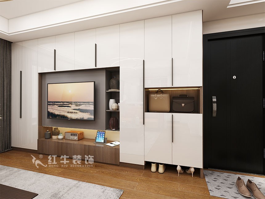 電視背景墻選用柜體做造型,簡潔大方,玄關(guān)也能更好地整合進(jìn)去,避免背景墻太短顯得小氣。