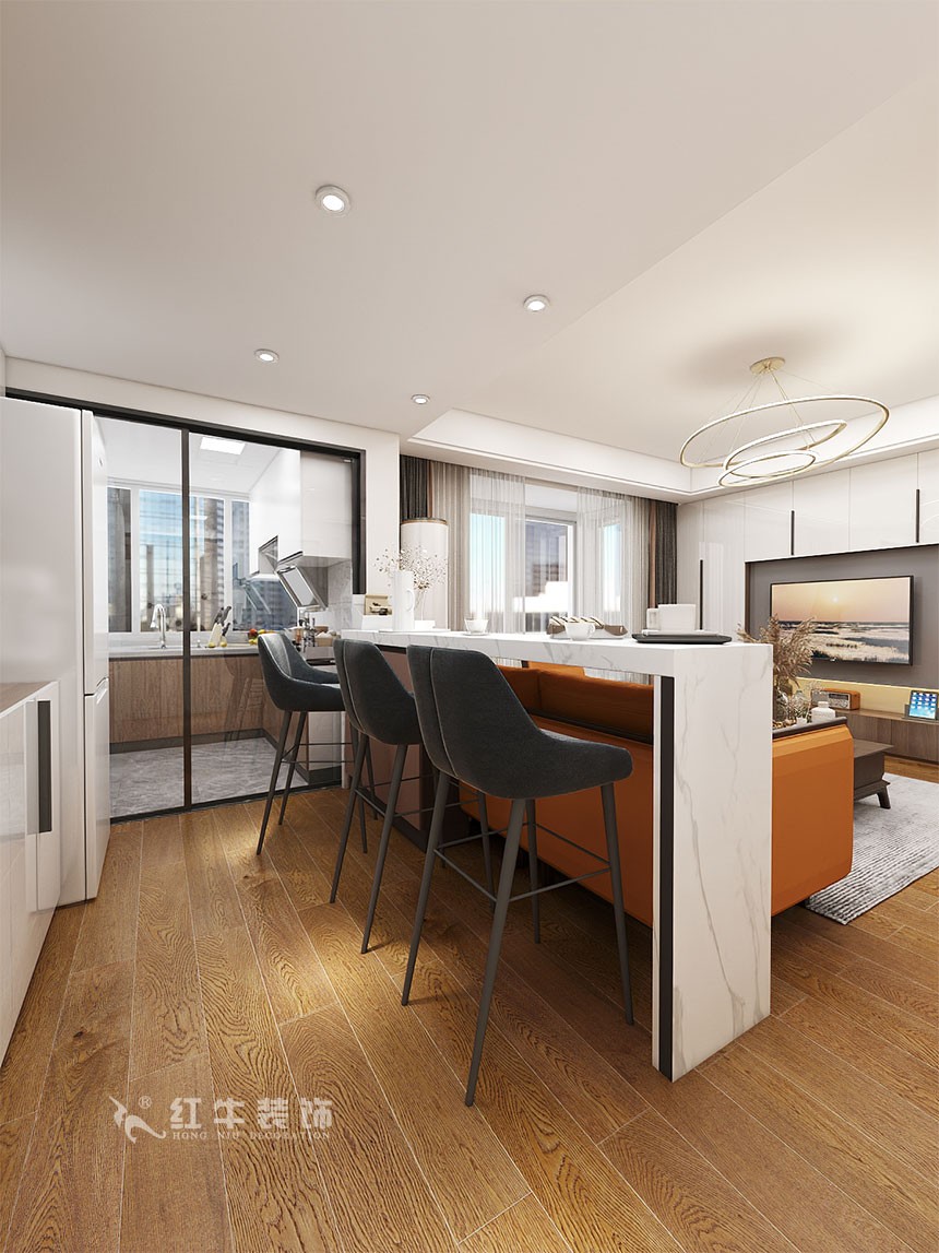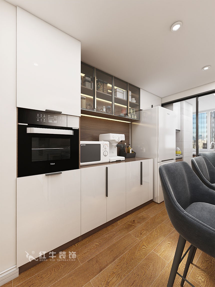 廚房區(qū)域進(jìn)行大改,中西廚兼具,西廚的吧臺作為沙發(fā)墻與客廳形成一個整體。