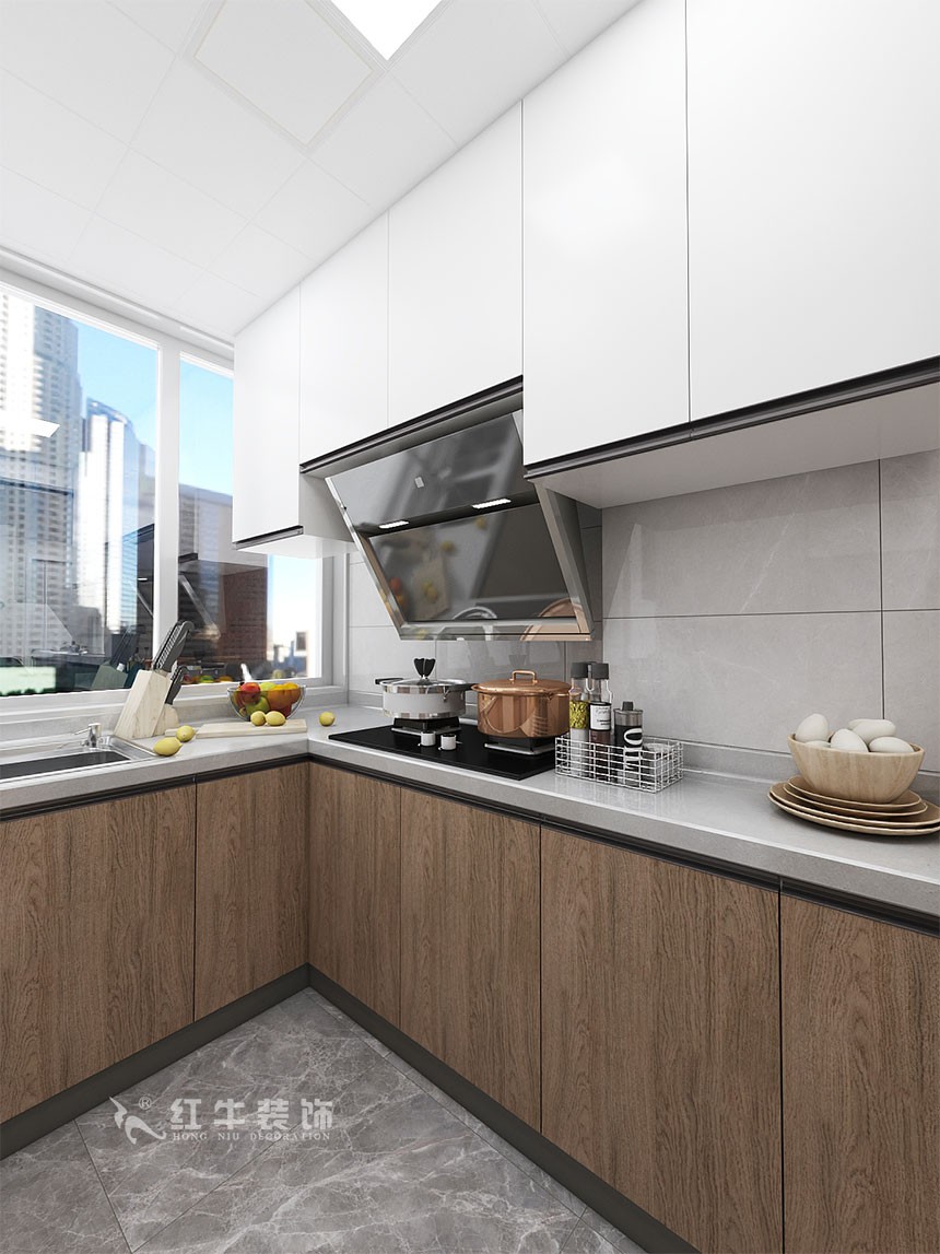 接近正方形的廚房空間里,設(shè)計了U型櫥柜,保證充足的活動空間。窗戶下方做水槽,水槽和灶臺的中間作為操作臺,洗切炒的動線非常流暢。