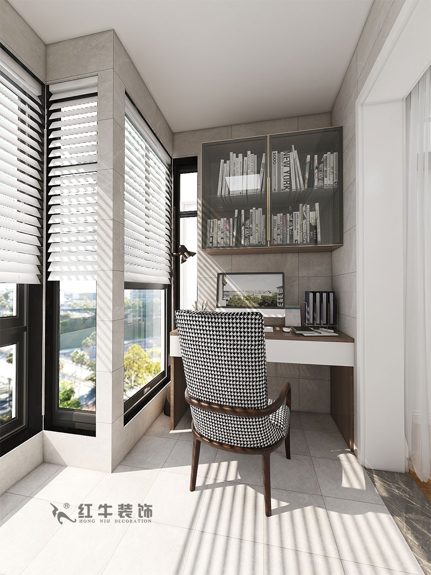 次臥的陽臺被打造成書房,搭配百葉窗,可以很好地調(diào)節(jié)光線,創(chuàng)造出舒適的學(xué)習(xí)環(huán)境。