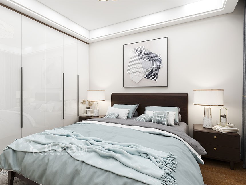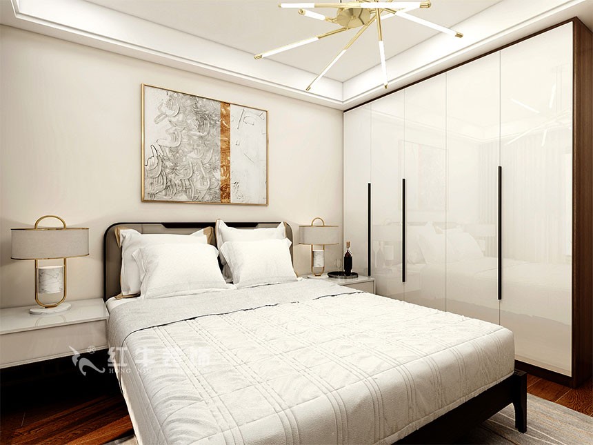 主臥布置方面遵循了對稱的原則,為房屋主人營造一個平衡的氛圍,處于臥室中央的大床看起來就非常柔軟舒適,有助于睡眠。