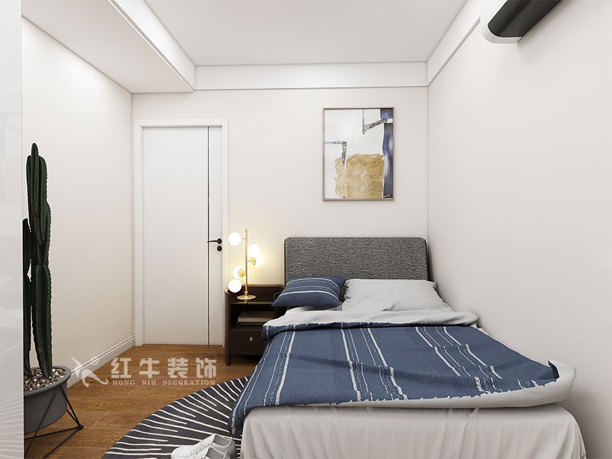 面積緊湊的小臥室作為客房使用,床靠墻擺放,留出足夠的通道和活動空間,然后在床頭多余的位置塞下一個床頭柜,動線比較合理。