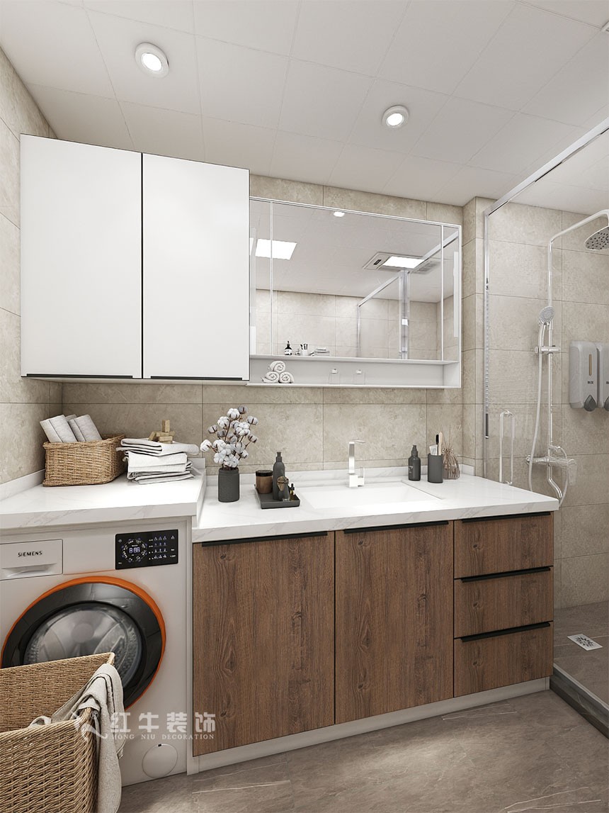 洗衣機(jī)放在門口,離淋浴區(qū)最遠(yuǎn),而且做好了干濕分區(qū),避免水汽造成安全隱患。每天洗澡之前,可以直接脫下衣服直接扔到洗衣機(jī)里面,非常方便。