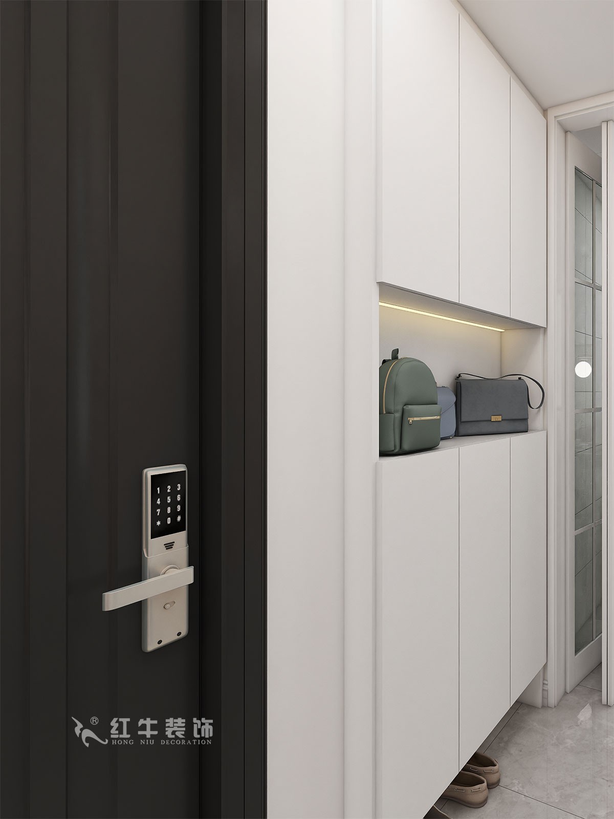 本案簡約風(fēng)格,通過隱形門設(shè)計避免入戶門對著衛(wèi)生間門的問題,在客廳區(qū)域增加足夠的儲物功能,在空間的設(shè)計上強(qiáng)調(diào)的是室內(nèi)空間開闊的理念,這樣的設(shè)計風(fēng)格沒有過多的裝飾物,主要以簡單的線條和裝飾簡潔的造型來體現(xiàn)出現(xiàn)代簡約型的設(shè)計。