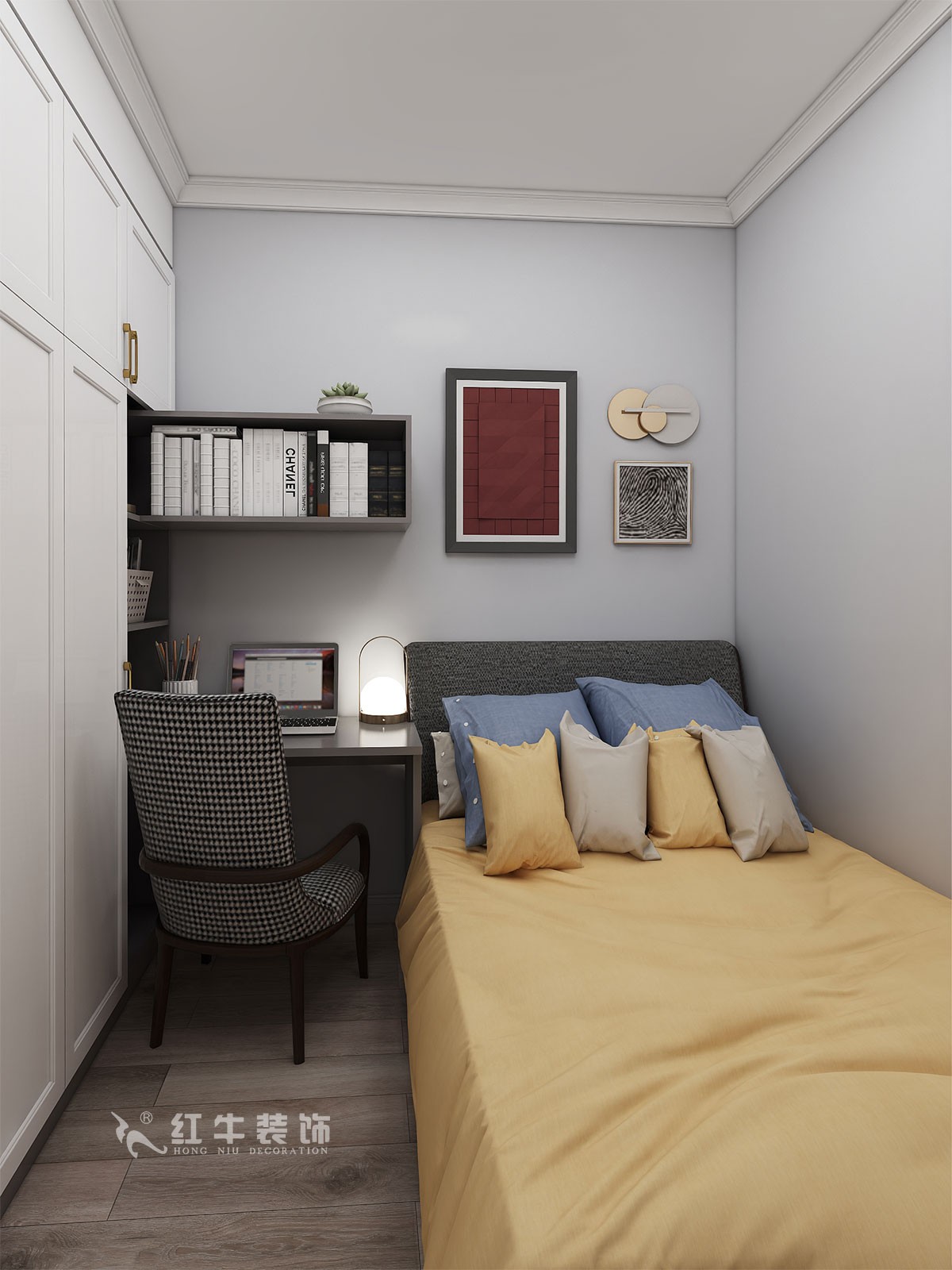 整體風(fēng)格簡約,白色和木紋色營造出溫馨的生活氣息,次臥室設(shè)計了組合柜,既有學(xué)習(xí)的區(qū)域同時也兼顧了休閑空間。