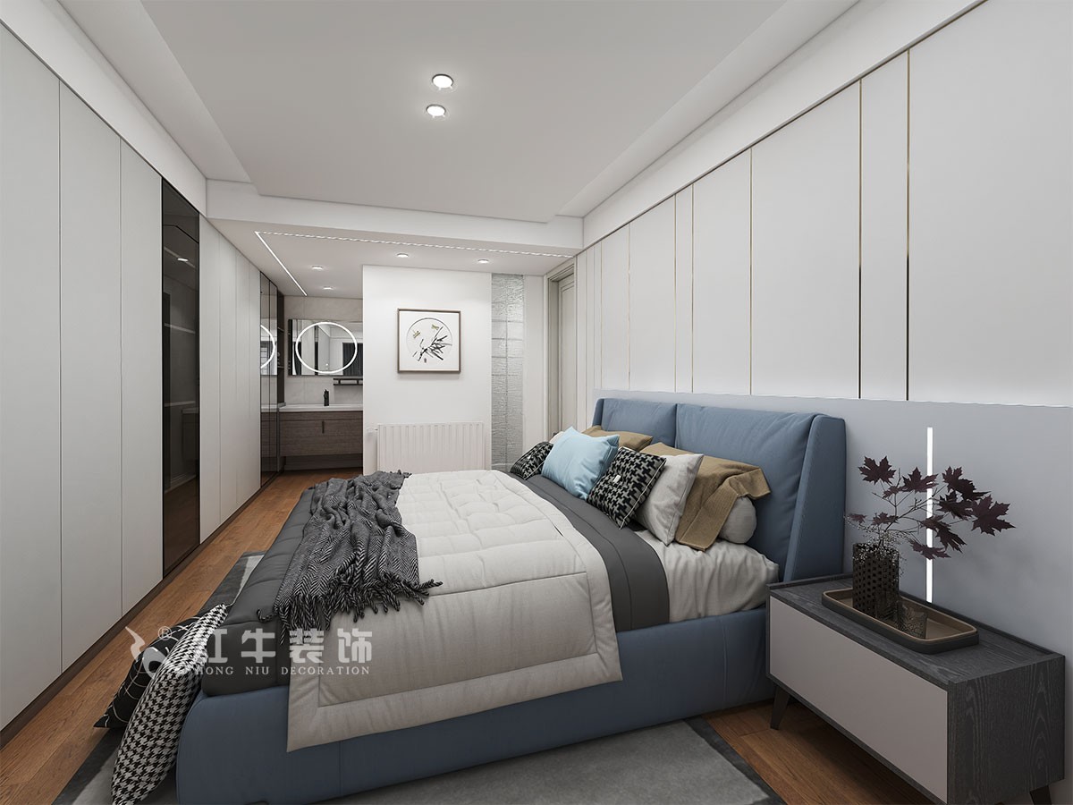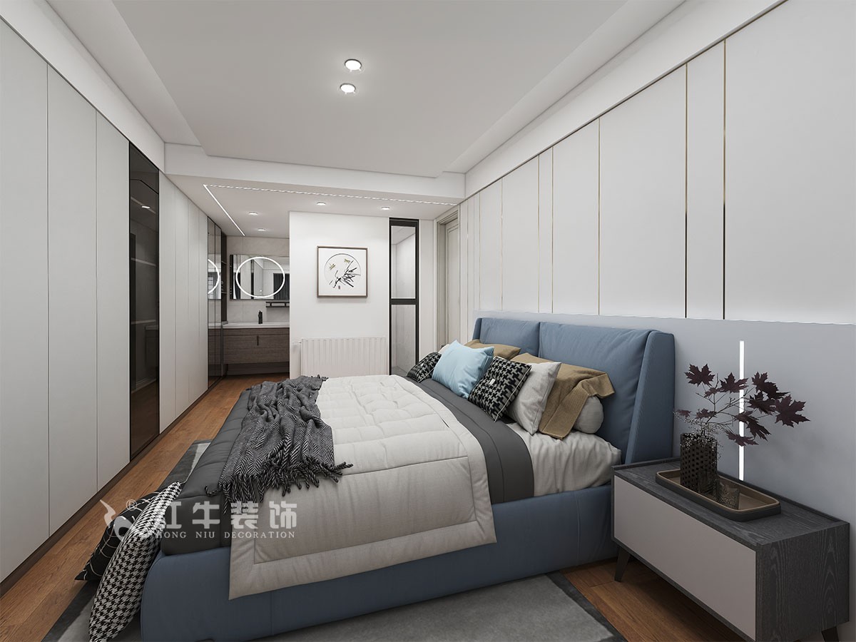 根據(jù)和客戶溝通,客戶喜歡現(xiàn)代風(fēng)格里面帶有一些中式文化的元素,但是整體造型還是希望是現(xiàn)代風(fēng)格,結(jié)構(gòu)上要求兩個衛(wèi)生間都是干濕分開,餐廳希望是圓桌。設(shè)計在結(jié)構(gòu)上做了很大的調(diào)整改變,客衛(wèi)生間的墻體進行了調(diào)整,干區(qū)的位置也進行了變化,這樣餐廳空間邊寬了幾十公分,另外客房的門洞進行偏移,同時也增加了客房的儲物空間,主衛(wèi)生間整體進行了偏移,主臥修改門洞的位置,這樣進門錯開了正對房門,也錯開了正對主衛(wèi)生間門口的缺點。另外主臥室做一整面墻的柜子,增大了儲物空間。解決了風(fēng)水問題,整體色調(diào)上淡藍灰色,家里的家具是客戶之前已經(jīng)挑選好的,主臥、次臥進行了無主燈的設(shè)計,床頭背景墻上都是采用了現(xiàn)在比較環(huán)保的竹纖維板定制護墻板,配套線性燈,簡潔明快有設(shè)計感。