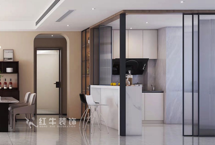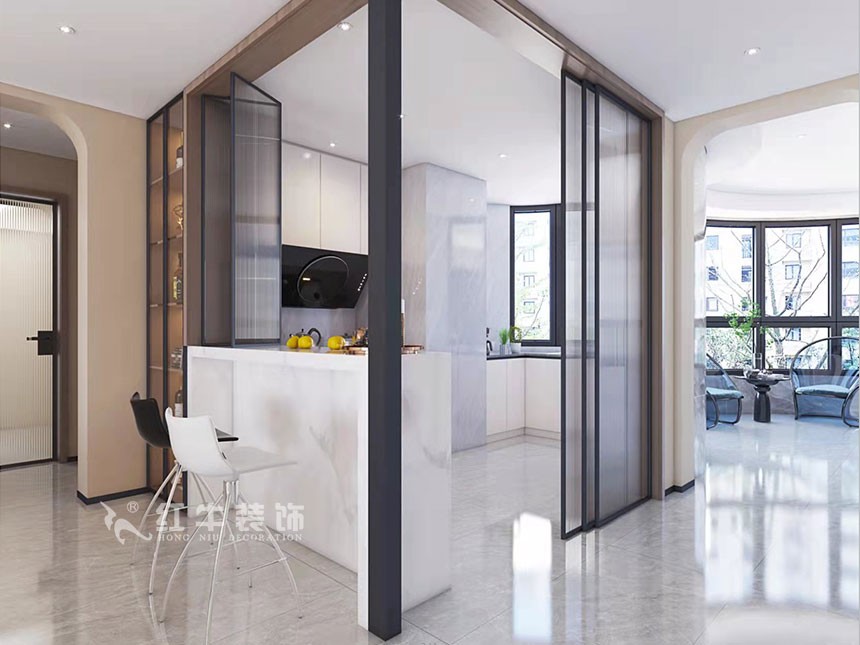 戶型方面尊重業(yè)主的意見,沒有過多調(diào)整,保留兩個衛(wèi)生間滿足同時(shí)使用的需求,減少主衛(wèi)面積打造屬于業(yè)主的衣帽間,整排的收納衣柜滿足業(yè)主的儲物需求;在餐廚空間設(shè)計(jì)上,打通廚房與餐廳的隔墻,增設(shè)一個吧臺,解決廚房窗戶狹小的問題,讓整個空間更加通透,同時(shí)增加設(shè)計(jì)的趣味性。