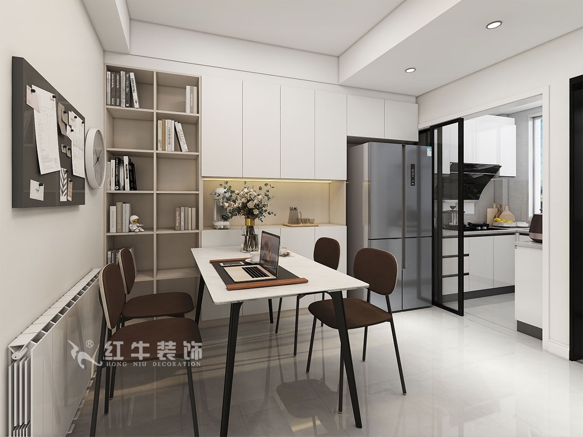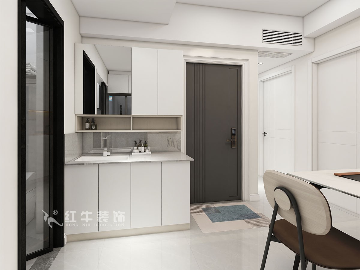 本案為城市中心學(xué)區(qū)房,一家三口居住,小朋友即將成為小學(xué)生,業(yè)主夫妻倆平時(shí)工作比較忙,經(jīng)溝通客廳只保留就餐兼顧辦公學(xué)習(xí)的空間。因廚房面積偏小,冰箱我們安排到了餐廳,衛(wèi)生間洗漱臺(tái)盆柜,也和進(jìn)戶鞋柜結(jié)合設(shè)計(jì)。兩個(gè)臥室的面積比較大,我們?cè)诨A(chǔ)的衣柜儲(chǔ)物上,又增加了其他儲(chǔ)物柜。