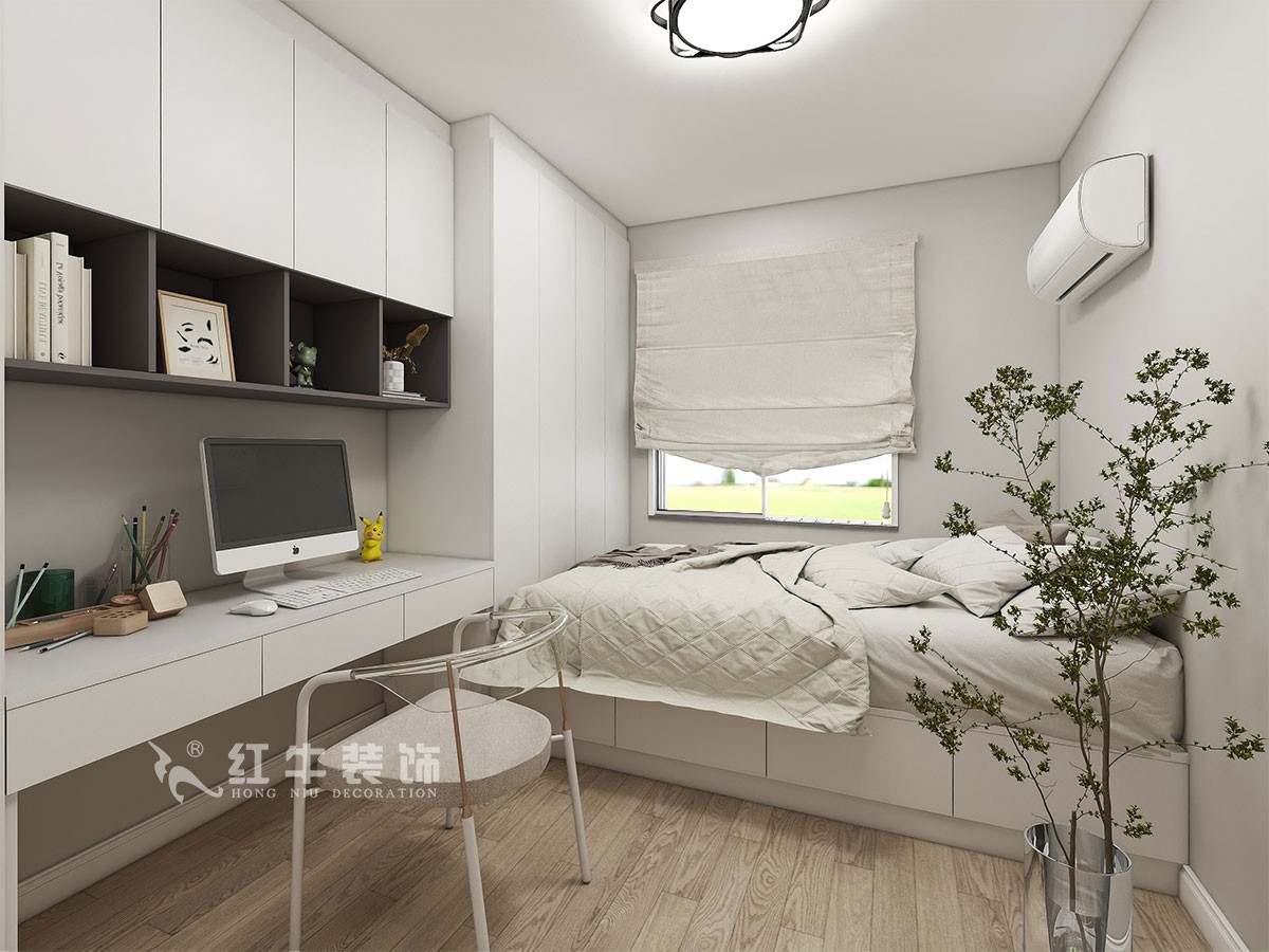 此案主要是婚房居住,在舒適度上要求比較高,臥室是整套房子中最私人也是最體現(xiàn)出溫馨休閑感的空間,在設(shè)計時體現(xiàn)出靜謐舒適的感覺,并且與其他空間明顯的區(qū)別,利用衛(wèi)生間砌墻,做干濕分離,把冰箱嵌入廚房,更好的布局。這樣舒適度更好,區(qū)域劃分明顯,動靜分離。吊頂簡潔大氣,配以輕現(xiàn)代家具,完美闡釋了簡約風格。整體現(xiàn)代簡約風格的設(shè)計,搭配上顯眼的綠色植物讓整個空間呈現(xiàn)出一種生機勃勃的自然美。